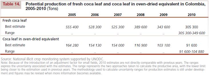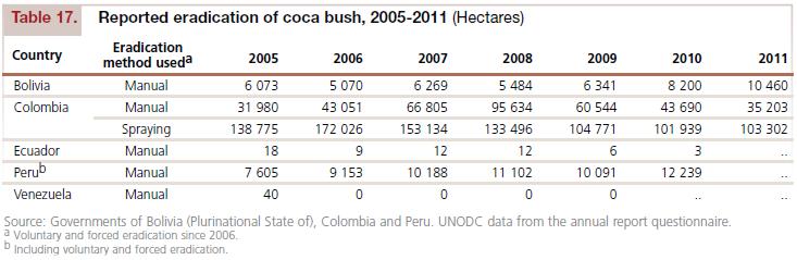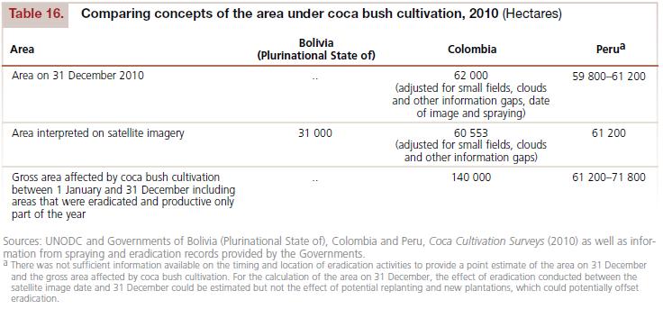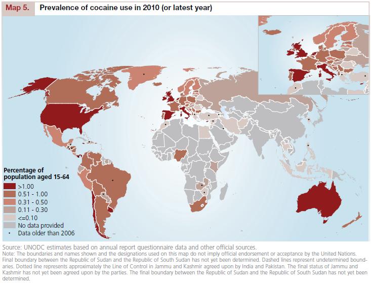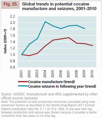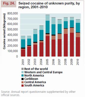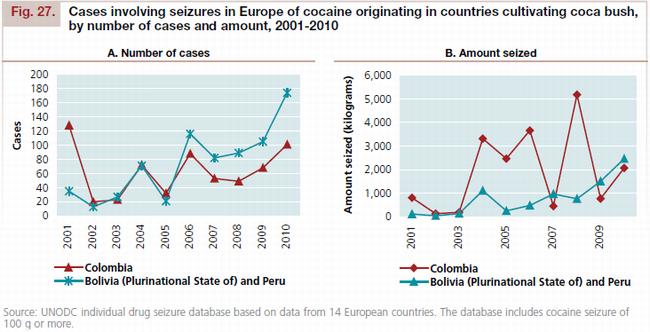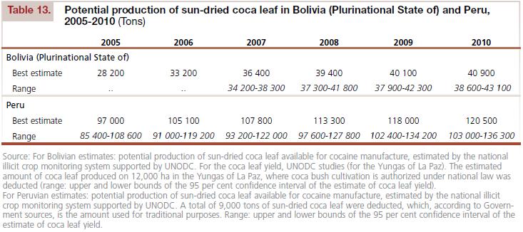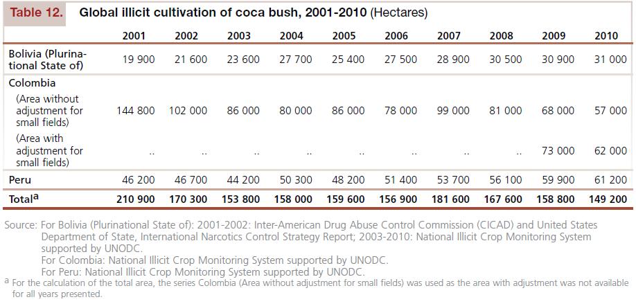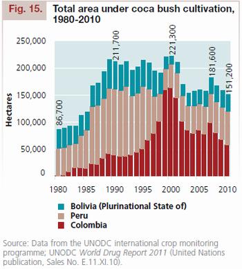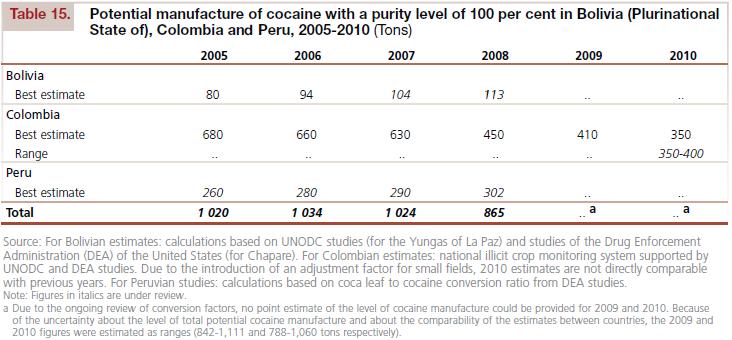 The general stability of global cocaine use and manufacture masks different trends in different regions and countries. Available data on cultivation, yield and trafficking indicate that there has been an overall decline in global manufacture of cocaine, prompted by a major decline in cocaine manufacture in Colombia in the five-year period 2006-2010. A sizeable shift has taken place as coca bush cultivation and coca production increased in the same period in the other two coca-producing countries, Bolivia (Plurinational State of ) and Peru, which are becoming increasingly important producers.