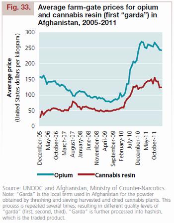 The latter may imply that illicit demand for opium and its derivatives is continuing to increase in spite of the recent recovery of opium production. While it is difficult to identify one specific reason for this, it could be an underestimation of global heroin consumption, especially in countries in Asia that are major markets and countries in Africa that are possible emerging markets, or to an expansion in the market for raw opium (not processed into heroin), which could feed increased opium consumption and, perhaps, a parallel illicit market for opiates such as morphine. High prices at source could also be explained by speculation in the local market.