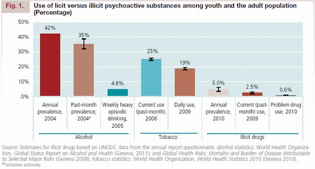 The extent of global illicit drug use remained stable in the five years up to and including 2010, at between 3.4 and 6.6 per cent of the adult population (persons aged 15-64). However, some 10-13 per cent of drug users continue to be problem users with drug dependence and/or drug-use disorders, the prevalence of HIV (estimated at approximately 20 per cent), hepatitis C (46.7 per cent) and hepatitis B (14.6 per cent) among injecting drug users continues to add to the global burden of disease, and, last but not least, approximately 1 in every 100 deaths among adults is attributed to illicit drug use.