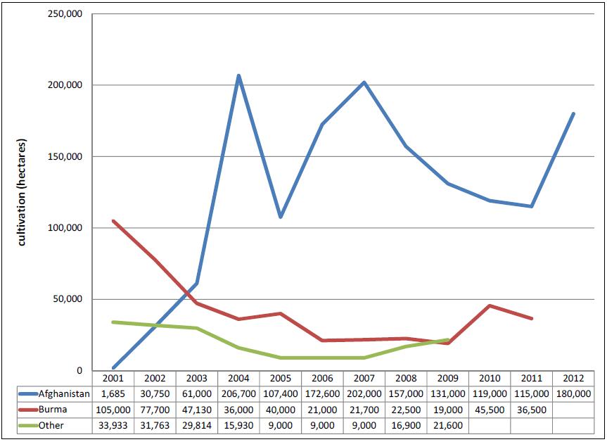 Figure 3. U.S. Estimates of Opium Poppy Cultivation, 2001-2012 Source: ONDCP, National Drug Control Strategy, Data Supplement 2013, April 2013.