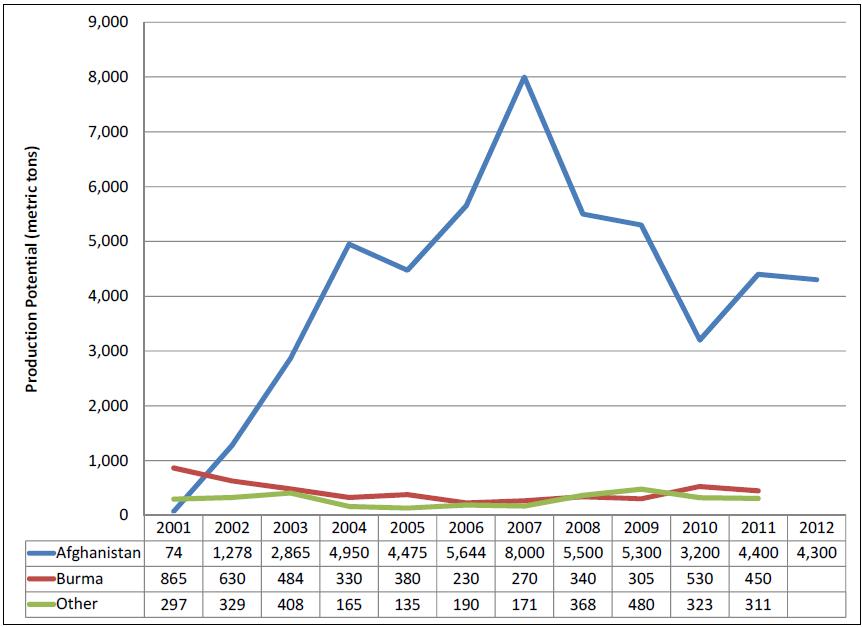 Figure 4. U.S. Estimates of Potential Opium Production, 2001-2012