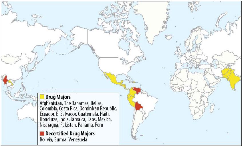 - Creating incentives for international cooperation on drug control: In order to deter foreign governments from aiding or participating in illicit drug production or trafficking, certain U.S. foreign assistance may be suspended to countries that are major illegal drug producers or major transit countries for illegal drugs, known as "drug majors." Similarly, certain drug majors countries may be deemed ineligible to be a beneficiary of preferential U.S. trade arrangements.