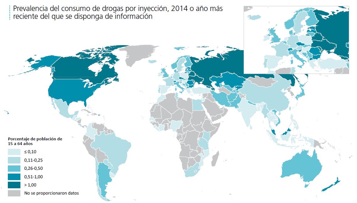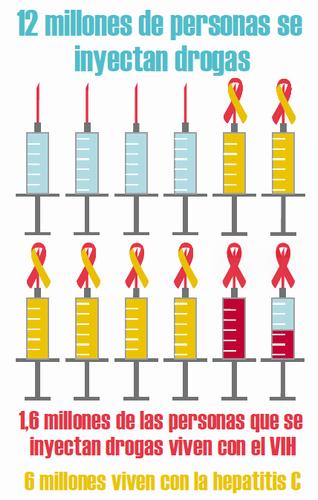 Las personas que se inyectan drogas se exponen a algunos de los peores daños para la salud asociados al consumo de drogas sin precaución, así como a un deterioro general de los resultados de salud, lo que incluye un alto riesgo de sobredosis, mortal o no, y a mayores probabilidades de muerte prematura. Una de cada siete personas que se inyectan drogas vive con el VIH, y una de cada dos con la hepatitis C. Esas personas son un grupo importante de la población en riesgo de contraer esas enfermedades: casi un tercio de los nuevos contagiados por el VIH fuera del África subsahariana son consumidores de drogas por inyección. Además, varios estudios han demostrado que las personas que se inyectan estimulantes incurren con más frecuencia que otras en comportamientos sexuales peligrosos, exponiéndose a un riesgo mayor de contagio por el VIH que las que se inyectan opiáceos.