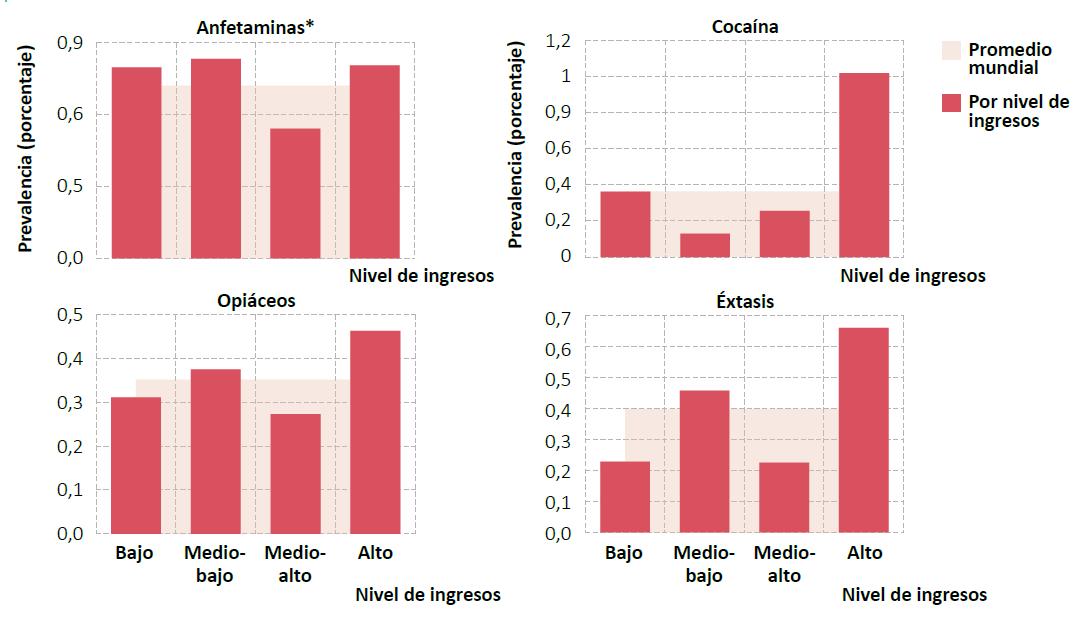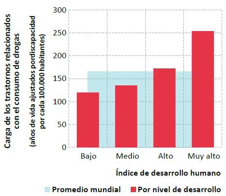 Aparte del grado de desarrollo, hay muchos factores, entre ellos la ubicación geográfica, que inciden en el carácter del problema de las drogas en un país determinado. La proximidad a una zona de producción de drogas o una ruta de tráfico importante puede explicar, por ejemplo, las tasas de consumo de opiáceos superiores a la media que se observan en el Cercano Oriente, el Oriente Medio y Asia sudoccidental, así como el consumo de cocaína, incluido el crack, en América del Sur y África occidental. El desglose de los datos nacionales sobre los consumidores de drogas por nivel de ingresos revela, sin embargo, que la prevalencia del consumo en el año anterior tiene a ser mayor en los países de ingresos altos. Las drogas por las que se pagan precios relativamente altos, y en definitiva más lucrativas para los traficantes, se introducen con mayor facilidad en los países de ingresos per cápita comparativamente elevados. En el caso de sustancias como la cocaína y la heroína, el grado de desarrollo económico contribuye a la formación de mercados de consumo grandes en cuanto al número de consumidores y las ganancias que reportan.