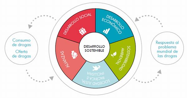 El problema mundial de las drogas está ligado a todos los aspectos del desarrollo sostenible. El análisis del problema de las drogas y de las medidas adoptadas al respecto, desde la perspectiva de los Objetivos de Desarrollo Sostenible, revela los mecanismos de esa interacción. Todos los ámbitos del desarrollo sostenible establecidos en los 17 Objetivos de Desarrollo Sostenible determinan la naturaleza y la dinámica del problema de las drogas. Al mismo tiempo, la forma en que el problema de las drogas y las medidas adoptadas al respecto repercuten en el desarrollo se observa en los planos individual, comunitario y nacional. Al analizar esos nexos, los 17 Objetivos de Desarrollo Sostenible se han dividido en cinco grandes esferas: desarrollo social, desarrollo económico, sostenibilidad ambiental, sociedades pacíficas, justas e inclusivas, y alianzas.