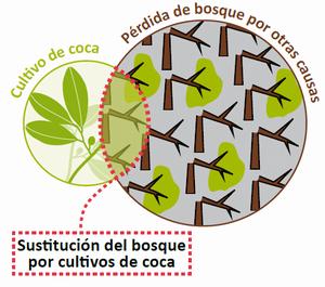 El cultivo ilícito tiene lugar con frecuencia en zonas boscosas y contribuye a la deforestación cuando conlleva la tala de bosques. Además, muchas veces se da en lugares de importancia decisiva para la biodiversidad en que viven muchas especies de hábitat limitado y que, en algunos casos, son zonas protegidas. Esas actividades tienden a realizarse cerca de la frontera agrícola, que marca el límite entre los bosques primarios y las zonas explotadas, y pueden conllevar la roturación de bosques. Aunque las pruebas empíricas y un análisis riguroso no corroboran la afirmación de que el cultivo ilícito es el principal factor de la deforestación, las investigaciones indican que la falta de desarrollo rural propicia ese fenómeno. Además, los análisis han demostrado que el tráfico de drogas puede incidir directamente en la deforestación, debido a la construcción de infraestructura como pistas de aterrizaje y caminos ilegales, así como indirectamente mediante la privatización de tierras públicas para crear "narcohaciendas". Cuando las iniciativas de erradicación obligan a trasladar los cultivos para la producción de drogas, ello puede causar deforestación, porque los agricultores reaccionan buscando zonas fuera del alcance de las fuerzas del orden.