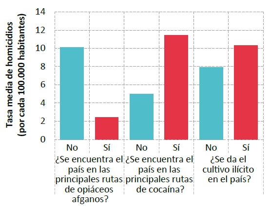 Sin embargo, el tráfico y la producción de drogas no necesariamente generan violencia, como demuestra el bajo número de homicidios en los países de tránsito afectados por las rutas de tráfico de opiáceos en Asia. Las variaciones podrían obedecer a las características del mercado y las organizaciones de tráfico de drogas: la competencia puede generar violencia en los mercados ilícitos, aunque también es posible que influya en ello la disparidad de las redes de tráfico en cuanto a su estructura interna, que puede caracterizarse por diversos grados de cohesión y jerarquización.