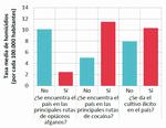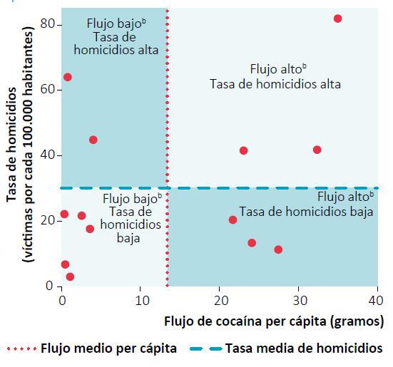 Haga click para ampliarFuentes: Estimaciones sobre el flujo de cocaína basadas en Estados Unidos, Oficina de la Política Nacional para el Control de Drogas, "Cocaine Smuggling in 2010", January 2012; homicide data from UNODC Homicide Statistics (2016). Disponible en www. unodc.org/unodc/en/data-andanalysis/homicide.html