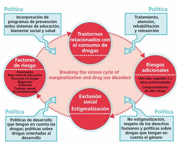 Objetivo de Desarrollo Sostenible 10. Reduce inequality within and among countries No reconocer o no comprender que la drogodependencia es un problema de salud refuerza el ciclo de marginación que a menudo afecta a las personas con trastornos relacionados con el consumo de drogas, lo que dificulta su recuperación e integración social. Además, la actitud estigmatizadora hacia los consumidores de drogas, en que podría incurrir incluso el personal de los servicios de atención de la salud, puede obstaculizar la administración de tratamiento eficaz a quienes más lo necesitan.
