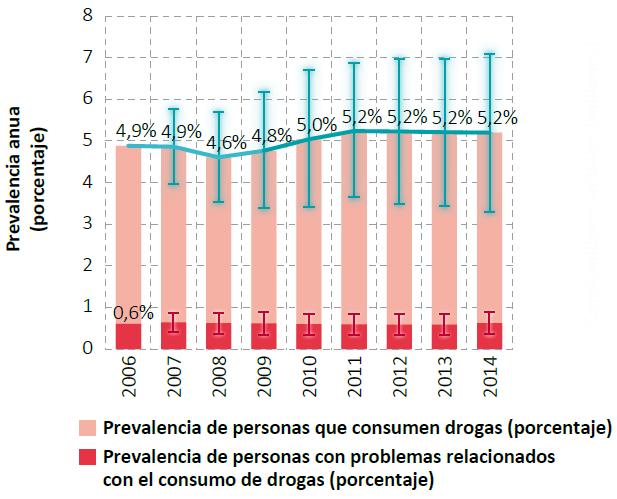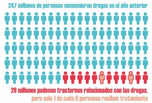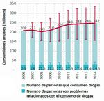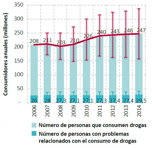 Se calcula que 1 de cada 20 adultos, es decir, alrededor de 250 millones de personas de entre 15 y 64 años, consumieron por lo menos una droga en 2014. Aunque considerable, esa cifra -que equivale aproximadamente a la suma de la población de Alemania, Francia, Italia y el Reino Unido- no parece haber aumentado en los últimos cuatro años de manera proporcional a la población mundial. Sin embargo, dado que se calcula que más de 29 millones de personas que consumen drogas sufren trastornos relacionados con ellas, y que 12 millones de esas personas son consumidores de drogas por inyección, de los cuales el 14% viven con el VIH, el impacto del consumo de drogas en lo que respecta a sus consecuencias para la salud sigue siendo devastador.