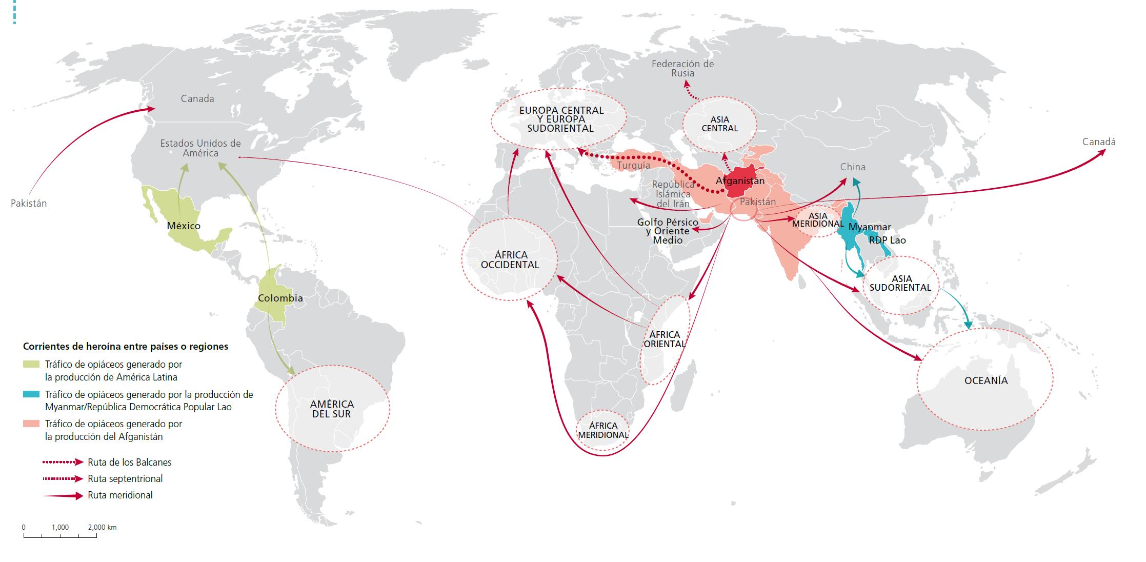 La llamada "ruta de los Balcanes", que abastece de opiáceos afganos a Europa occidental y central a través de la República Islámica del Irán y Turquía, pasando por Europa sudoriental, sigue siendo la ruta de tráfico de heroína más importante. Sin embargo, ha adquirido más importancia la llamada "ruta meridional" (que pasa por el Pakistán o la República Islámica del Irán y se dirige por mar hacia la región del Golfo, Africa (especialmente África oriental), Asia meridional y, en menor medida, Asia sudoriental, la región de Oceanía y América del Norte). Mientras tanto, ha comenzado a resurgir, tras haberse reducido en el período 2008-2012, el tráfico de opiáceos por la llamada "ruta septentrional", que va desde el Afganistán hacia los Estados vecinos de Asia central, la Federación de Rusia y otros países de la Comunidad de Estados Independientes, al tiempo que va intensificándose el tráfico desde el Triángulo de Oro, principalmente por el aumento de los niveles de producción de opio registrado en Myanmar después de 2006. Además, el tráfico de heroína sigue aumentando en América, donde la incautación de heroína y morfina aumentó de un promedio de 4 toneladas en el período 1998-2008 a 7 toneladas anuales en el período 2009-2014, lo que está en consonancia con el aumento de la producción de opio comunicado en América Latina durante esos períodos.