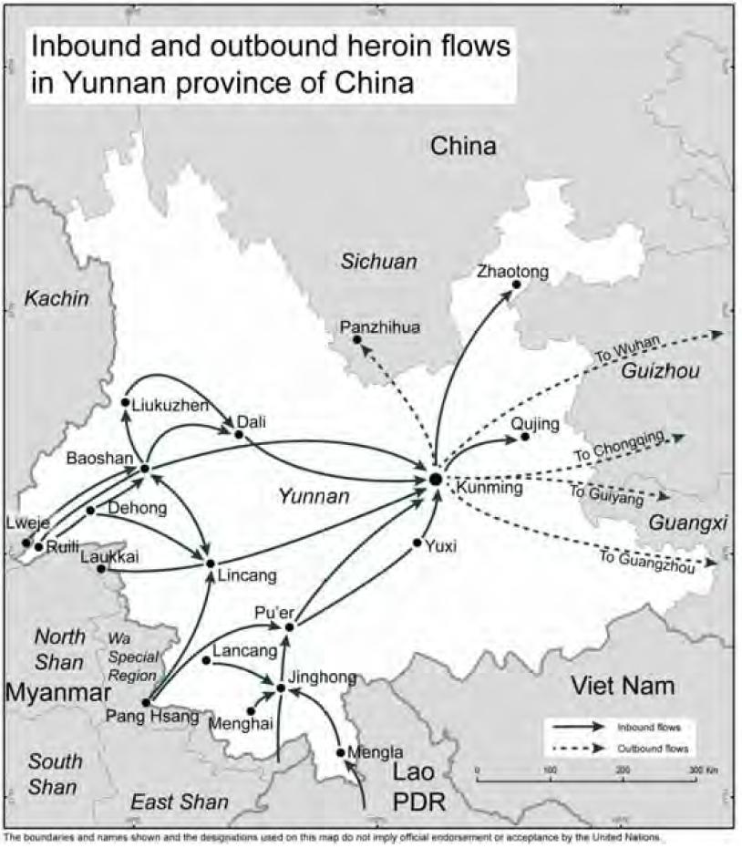 Map 1: Inbound and outbound heroin flows in Yunnan province, China. Source: UNODC, Transnational Organized Crime in Southeast Asia and the Pacific: A Threat Assessment (TOCTA) 2013.