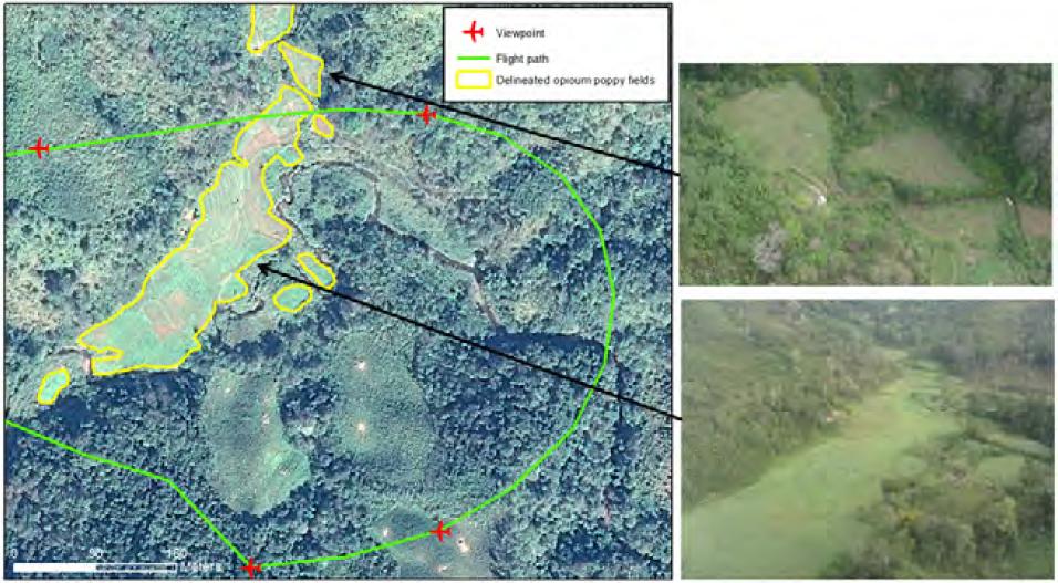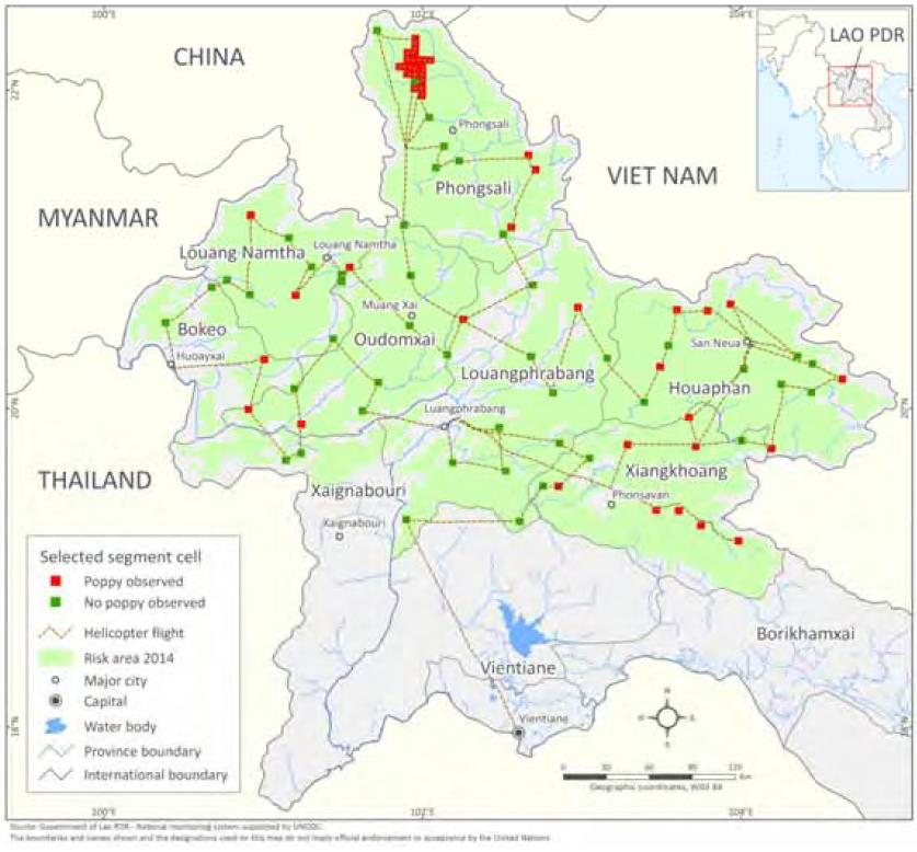 In Lao PDR, no socio-economic survey of poppy-growing villages has been conducted in recent years. However, the data collected during helicopter flights and satellite image analysis indicated that poppy cultivation in 2014 also continued to be a phenomenon linked to villages in peripheral, difficult-to-access locations, far from population and market centres.