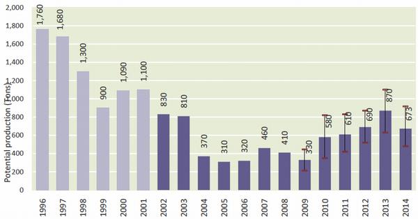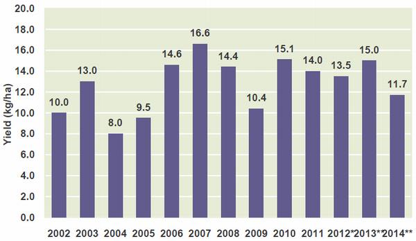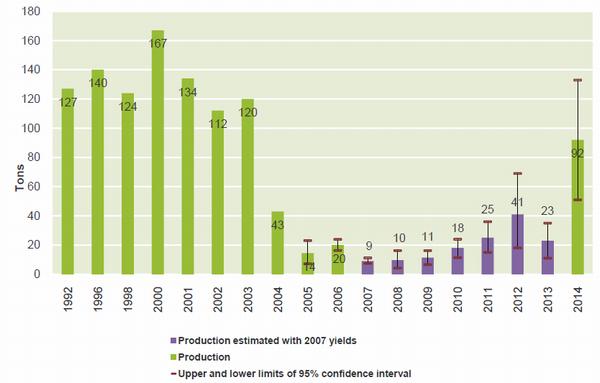 29. In the absence of more recent yield surveys, the result of the 2007 yield survey was used for the years 2007-2013. [Back]