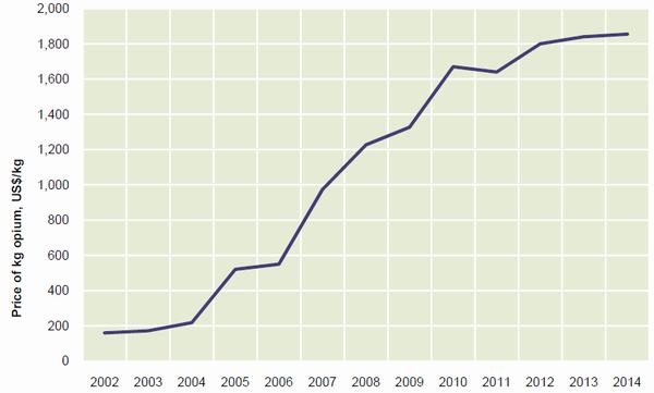 In Afghanistan, however, average opium yield amounted to 28.7 kilograms per hectare in 2014, some 9% more than in 2013 (26.3 kilograms per hectare). The subsequent increase in production in Afghanistan boosted the global opium supply in 2014.