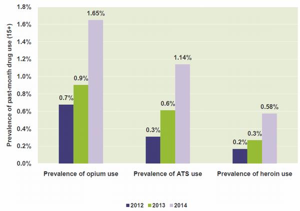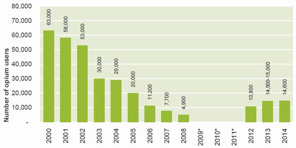 Estimates suggested that there were over 3.3 million opiate users in East and Southeast Asia in 2014 (table 1), |14| a number that may rise as the populations of countries in the region increase and if current trends continue. Moreover, as most countries in the region do not regularly conduct national drug-use surveys, these estimates are limited. In particular, there remains substantial uncertainty about the number of users in China, where estimates are solely derived from data on government-registered users. |15|
