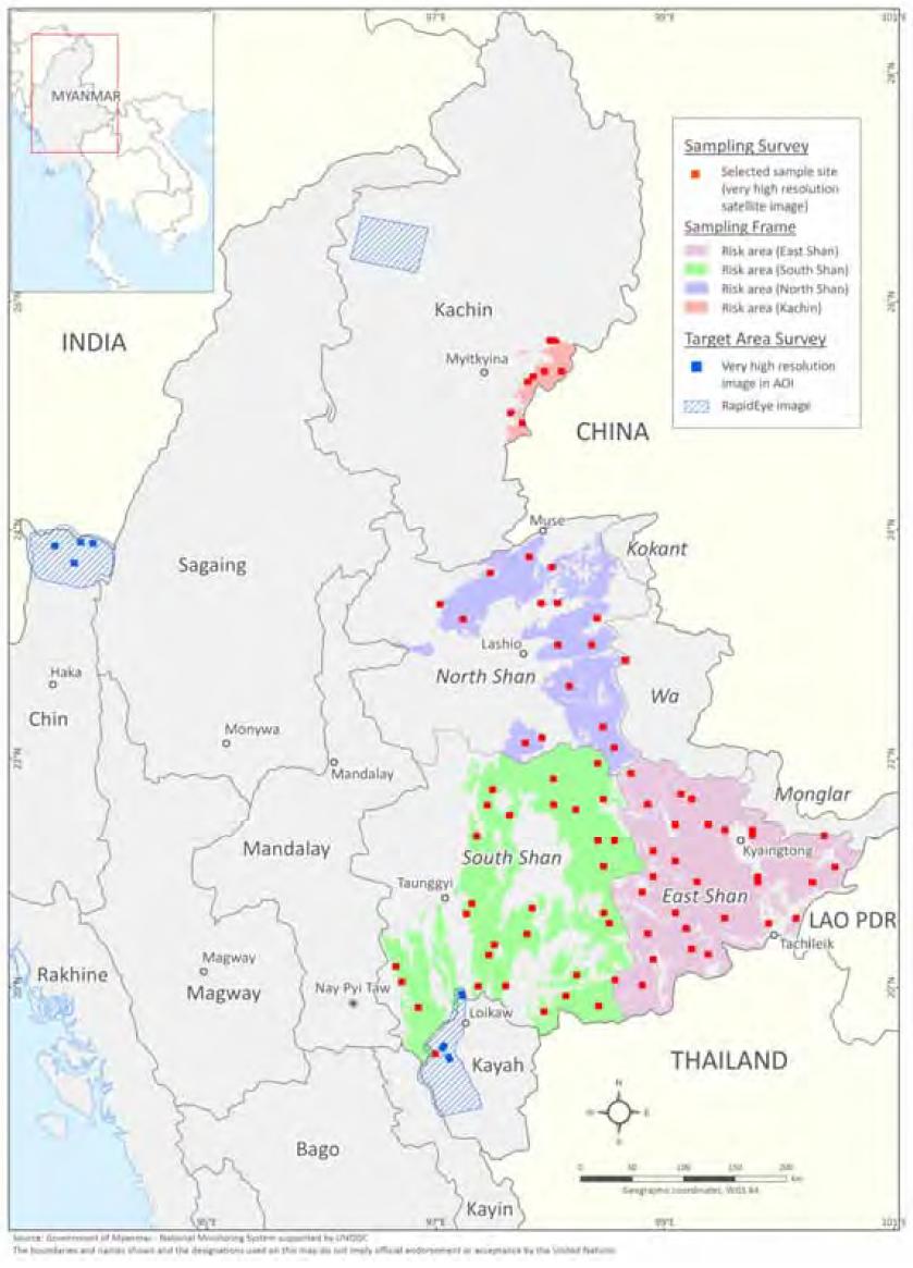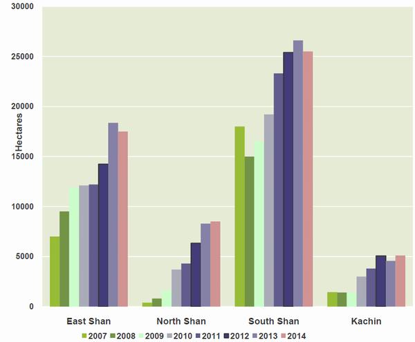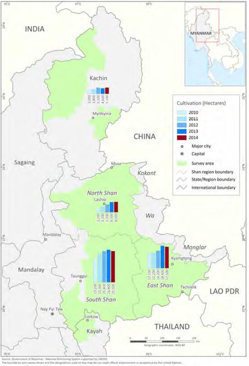 61. In 2014, opium cultivation was measured for the first time in Kayah and Chin, but is not shown here due to a lack of trend data. [Back]