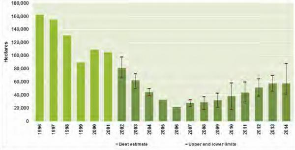 32. In the absence of updated yield estimates, in 2013 estimated yield per hectare from 2007 was used. In 2014, a yield survey was conducted for the first time since 2007. A year-to-year comparison is therefore not possible. [Back]