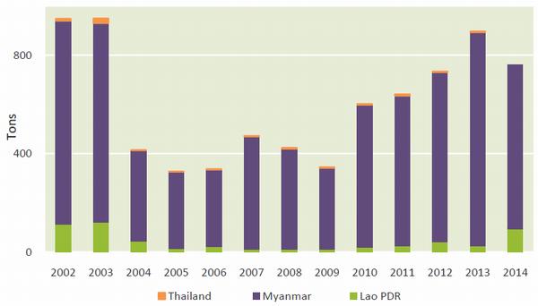Figure 3: Opium production in cultivating areas in Lao PDR, Myanmar and Thailand,* 2002-2014