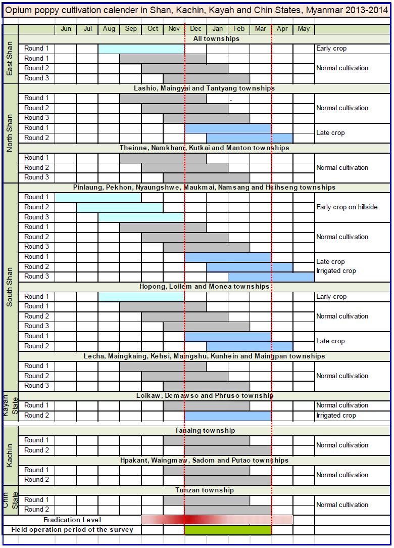 A rapid assessment survey was also conducted in Mongla Region (S.R.4) to certify its opium poppy-free status. The survey was carried out in February 2014. Due to various reasons, the survey team could not visit the target areas. The survey indicated no evidence of poppy cultivation in this region, which has been opium-free since 1997.