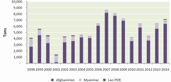 Figure 4: Opium production in major producing countries, 1998-2014 (Tons)