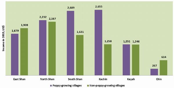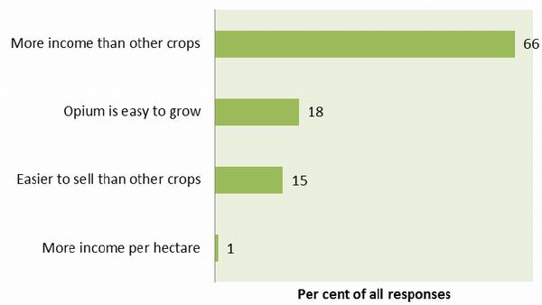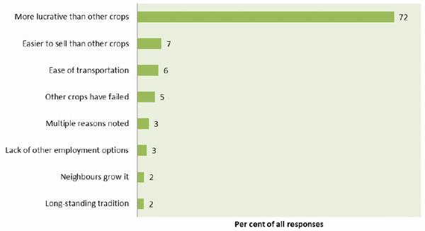 The link between poverty, a lack of alternative livelihood options and the decision to cultivate poppy is clear. The majority of respondents to the 2014 socio-economic survey in Myanmar described the need to provide for basic necessities, such as food, education and housing, as a reason for cultivating opium poppy. The difficulties involved in the cultivation of crops other than opium poppy, and the barriers to transporting goods to market, mean that villagers in remote areas have limited options for earning alternative income.