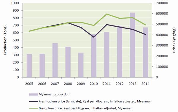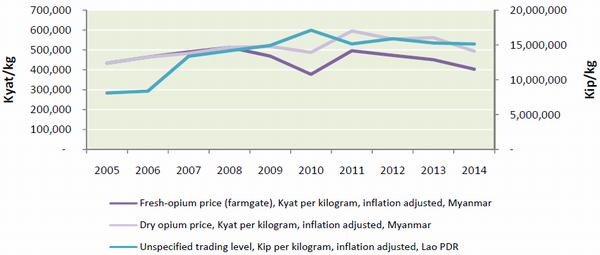 Inflation-adjusted opium prices in local currency remained stable in Myanmar from 2005 to 2014. After an increase between 2005 and 2010, prices in Lao PDR also stabilized. The relative stability of prices and production in Southeast Asia since 2011 is evidence of a market in equilibrium with demand, which may be supplemented by increased production in Afghanistan as the numbers of opiate users in Asia expands with population growth.