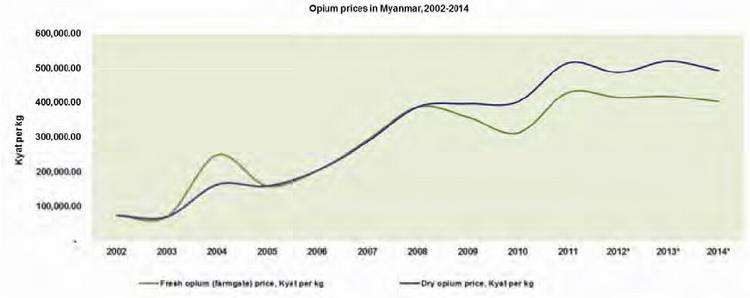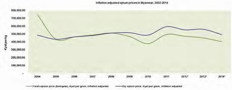 Farm-gate prices in Myanmar in 2014 reflect the price prior to drying and trafficking. The price escalation in the country at the trader level was approximately 20% higher, representing the immediate price hike after opium has left the grower. After 2011, opium prices (farm-gate and dry) appeared to decline slightly as production increased.