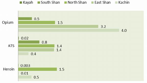 62. Numbers in brackets indicate upper and lower limits of the best estimate. Kayah and Chin were added to the 2014 opium survey. Chin was added for the first time, while Kayah was sampled after several years of absence of estimates for that region. [Back]