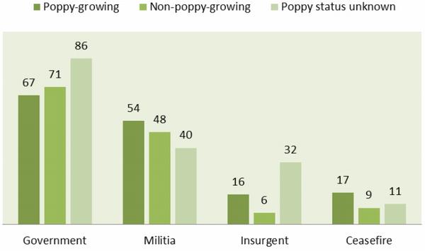 In the 2013 survey, reports from the field indicated the existence of a fourth type of involvement, called communal poppy farming, whereby the village community operates a poppy field to earn income for a community purpose. In such cases, households work in a poppy field without receiving payment, but as communal poppy farming does not generate income at the household level, it was not included in the household-involvement typology. The 2013 survey results indicated that only a very small proportion of poppy fields fell into the communal poppy cultivation category.
