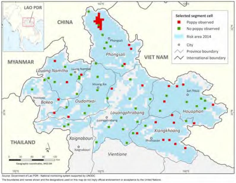 Although the majority of opium production in Southeast Asia is confined to parts of Myanmar, particularly Shan State, a smaller, yet significant, amount is also produced in Lao PDR. The 2014 Opium Survey reported no significant changes in opium production in Myanmar and Lao PDR from 2013: the total combined area under opium cultivation in the two countries was estimated to be 63,800 hectares in 2014, compared to 61,700 hectares in 2013. |5|