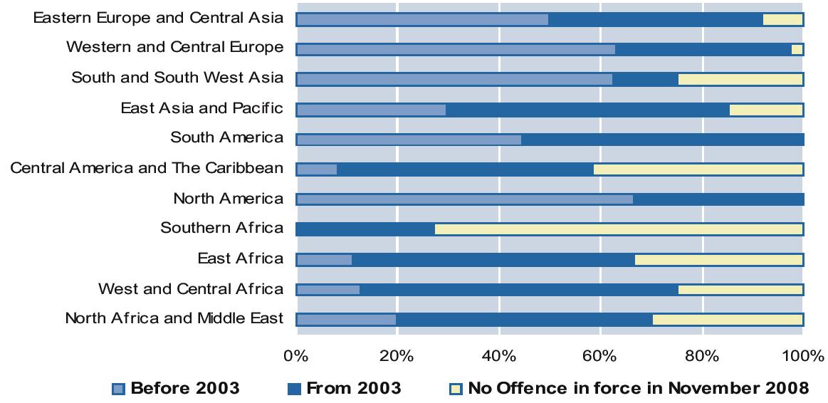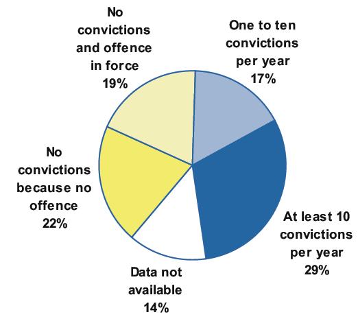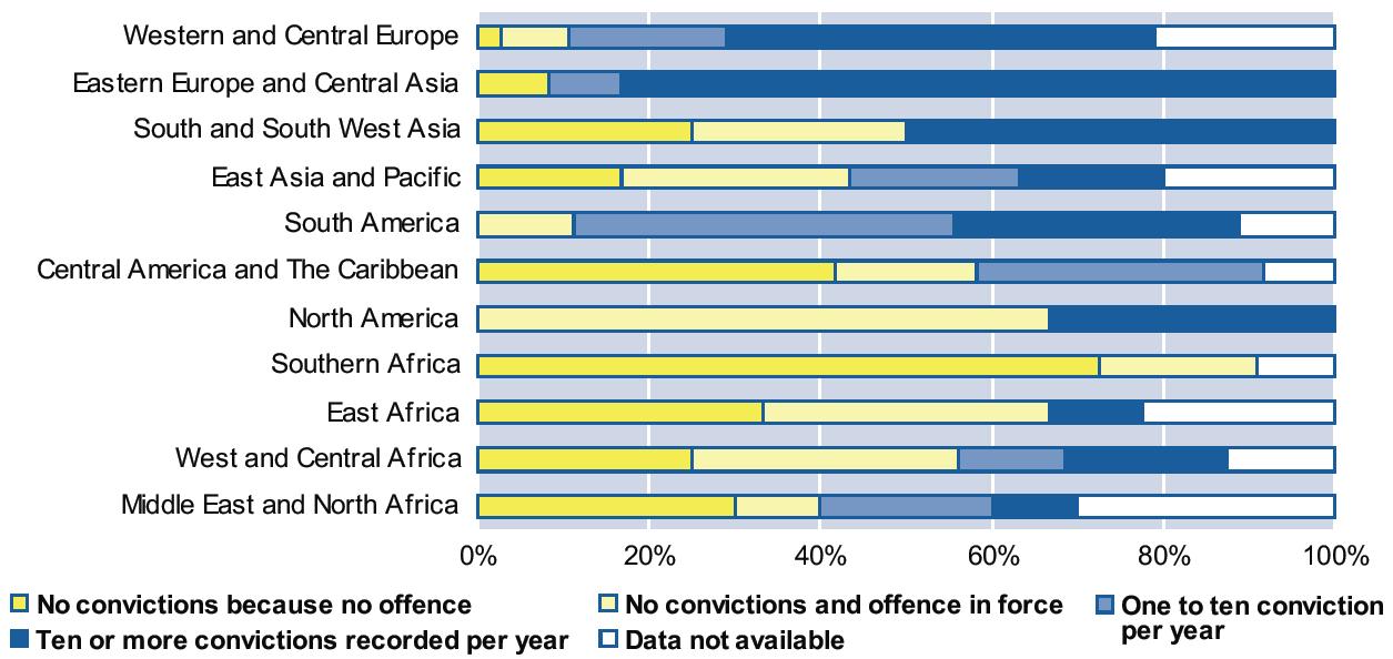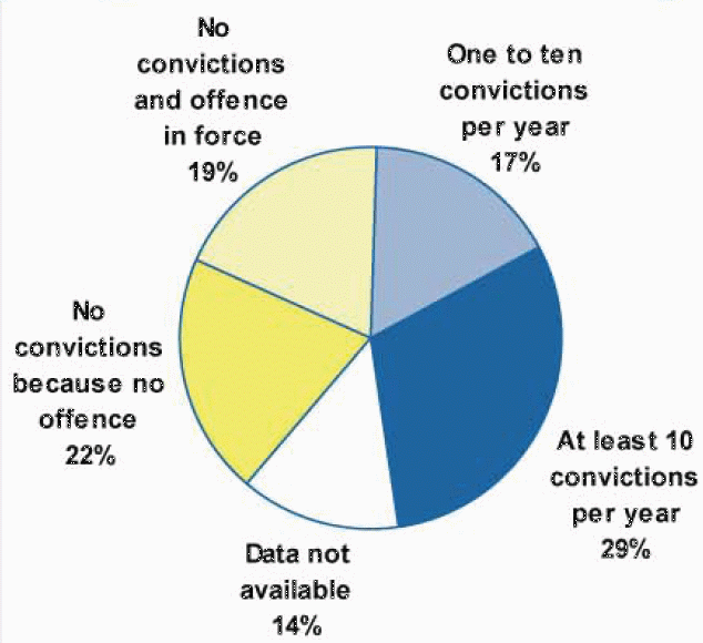 11. About 10 out of 61 of these countries and territories are in the small Pacific Islands and the East Caribbean. The percentage of countries where no convictions were recorded would be 33% if these countries and territories were not taken into consideration. [Back]