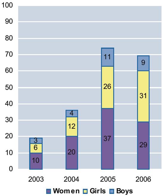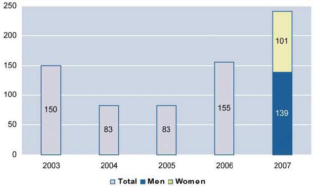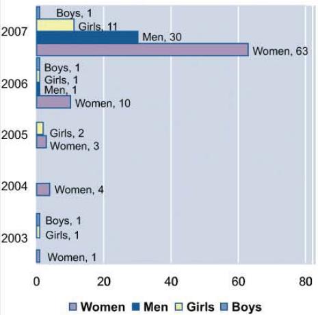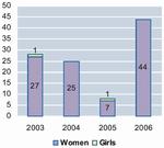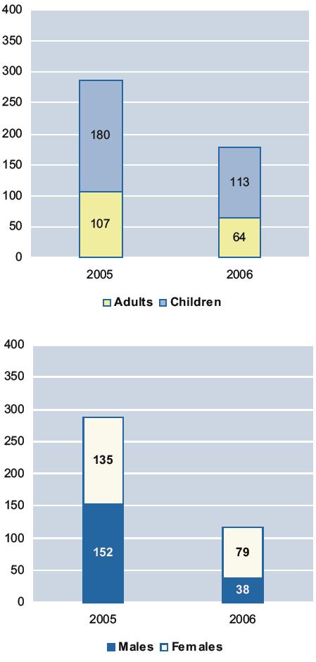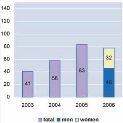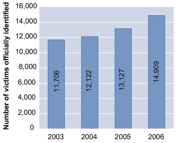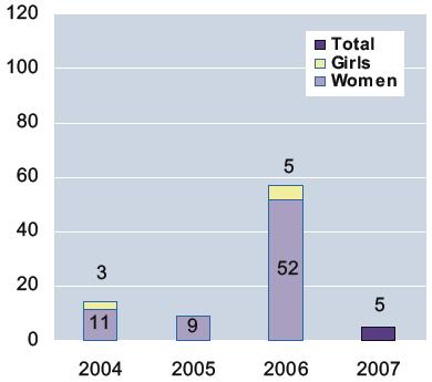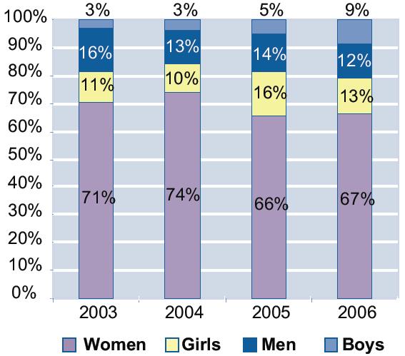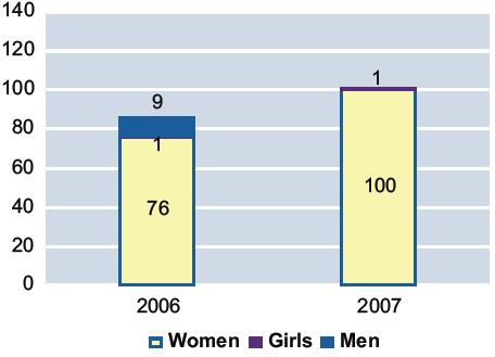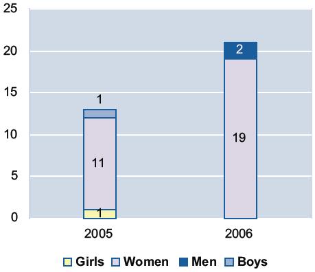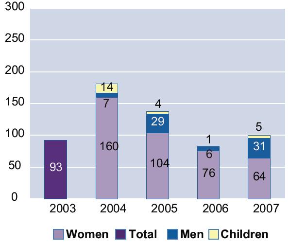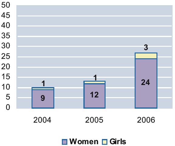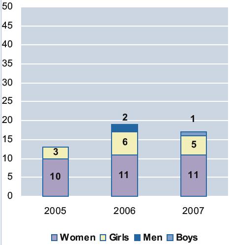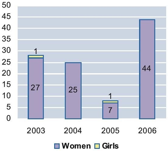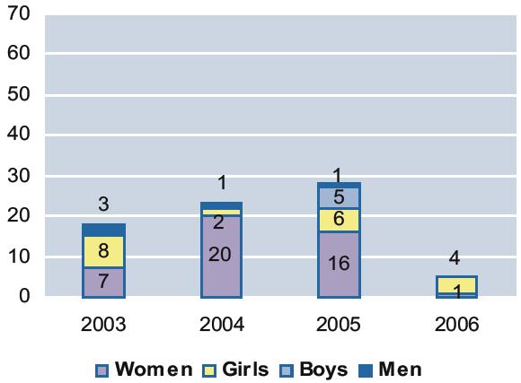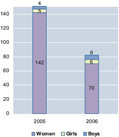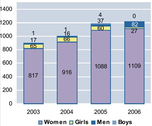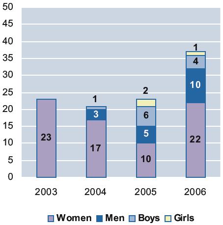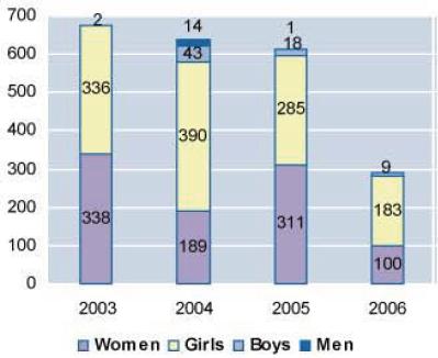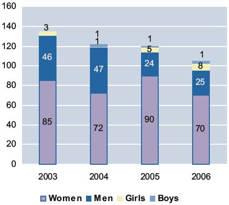 16. The number of countries reporting the profile of the victims according to age and gender increased (44 in 2003; 56 in 2004; 76 in 2005; and 61 in 2006) [Back]