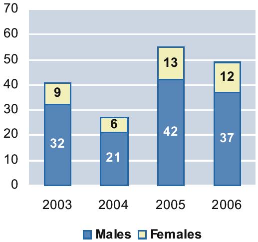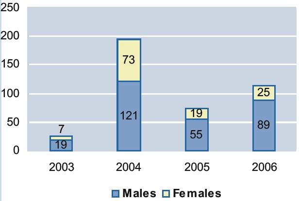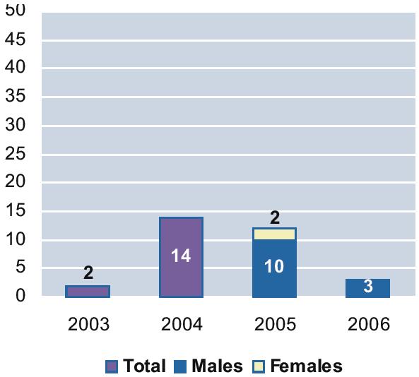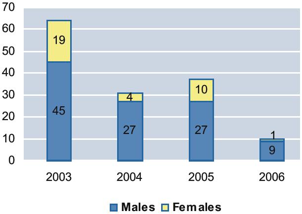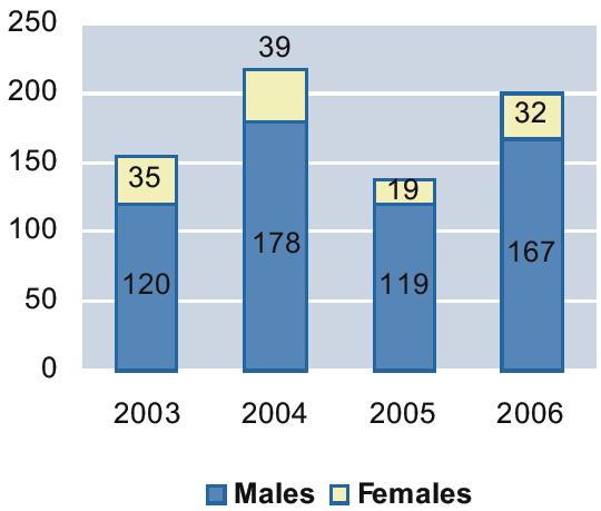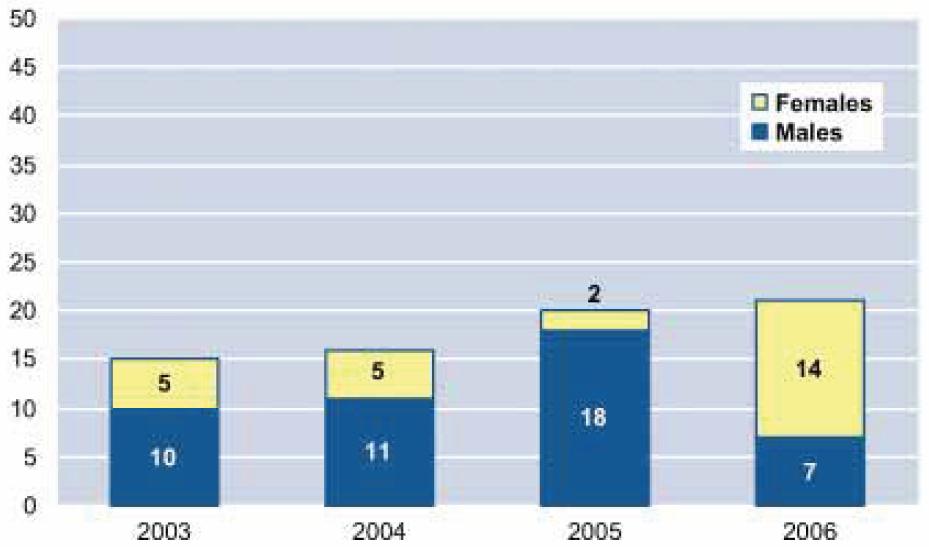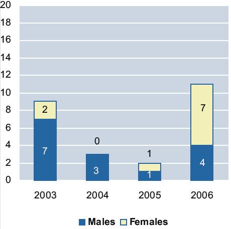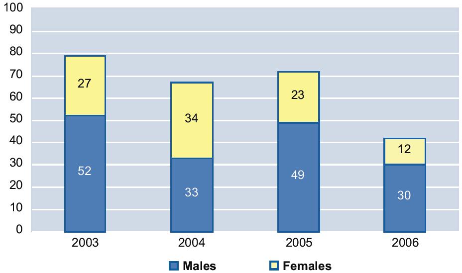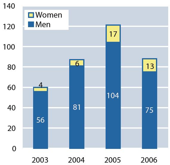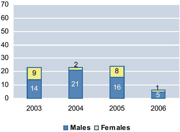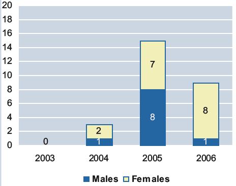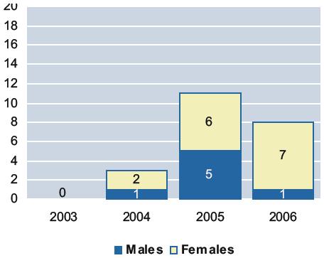 Fig. 380: Persons suspected of trafficking in persons in Sweden, by gender (2003-2006) Fig. 381: Persons convicted of trafficking in persons in Sweden, by gender (2003-2006) Source: National Council for Crime Prevention