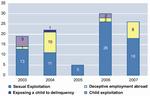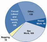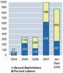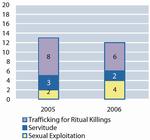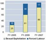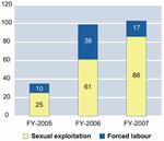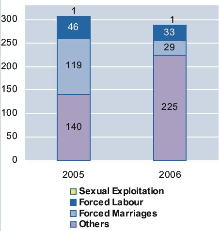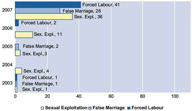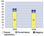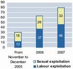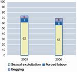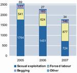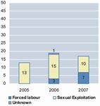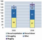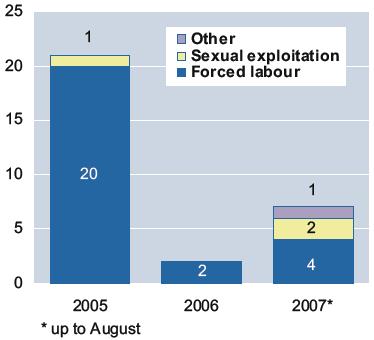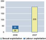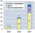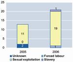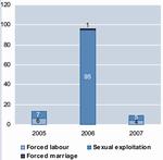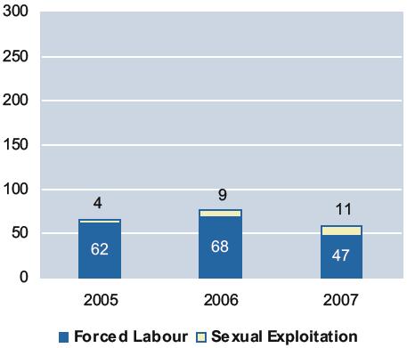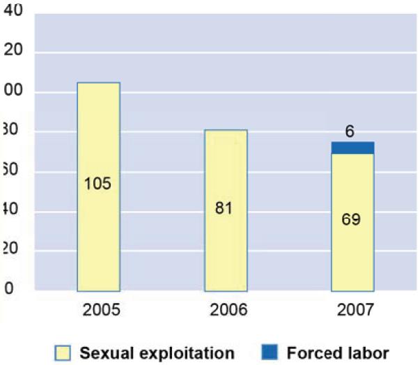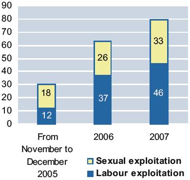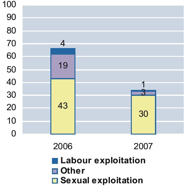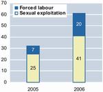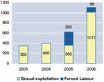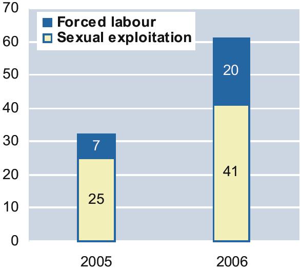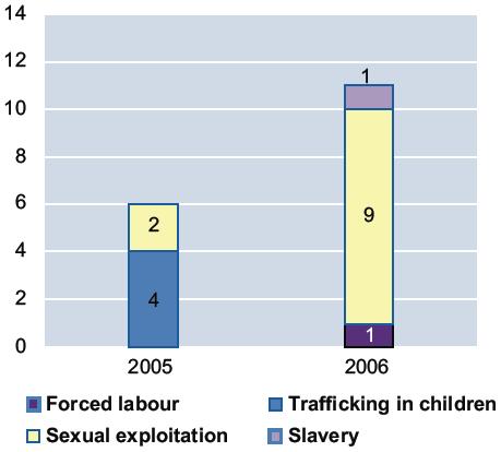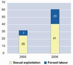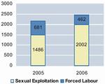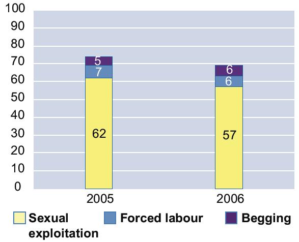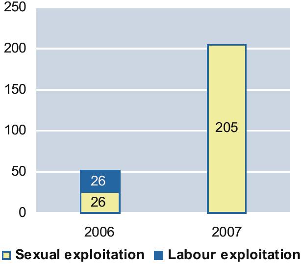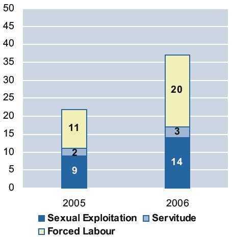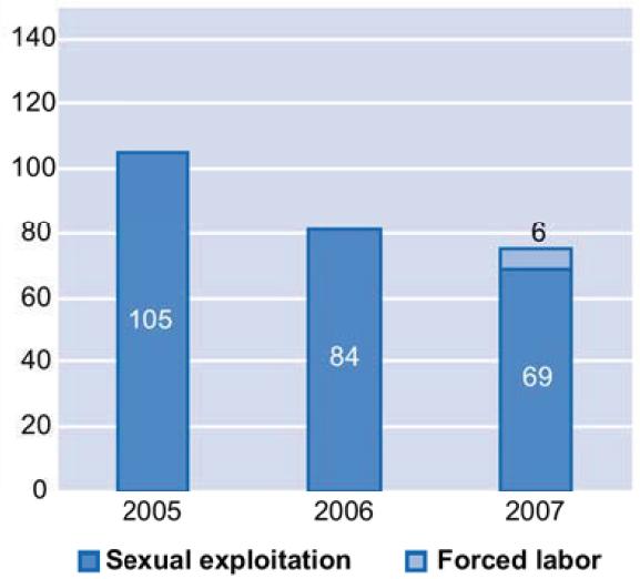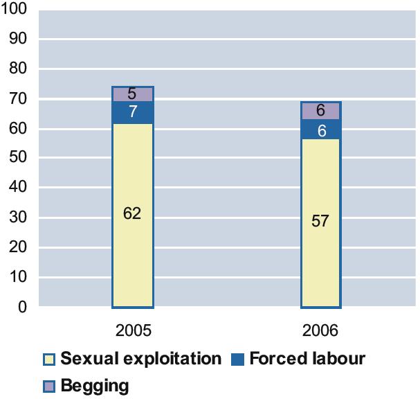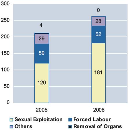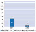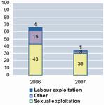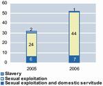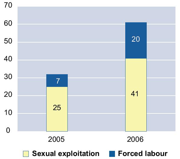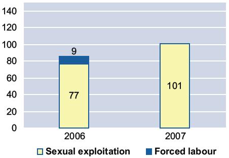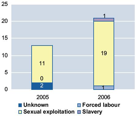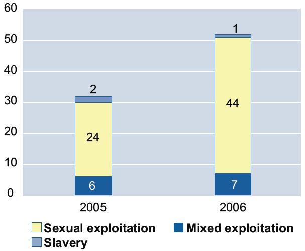 In 2005, six of the identified victims of human trafficking were trafficked for the purpose of sexual exploitation, and one was subjected to slavery. In 2006, forty-one victims were subjected to sexual exploitation and three to slavery.