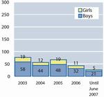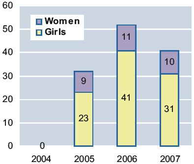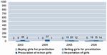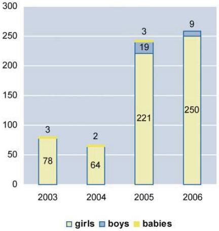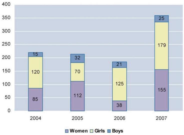 Fig. 383: Victims of forced prostitution (Art. 195 SCC) and trafficking in persons (Art. 196 SCC) counselled by recognized -victim advisory centres-in Switzerland, by age (2003-2007) Fig. 384: Victims of trafficking in persons counselled by the Women's Information Centre (FIZ) (2003-2006) Source: Federal Statistical Office