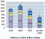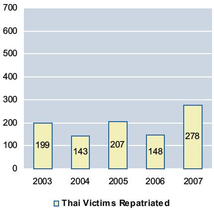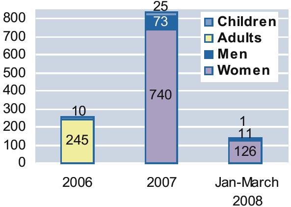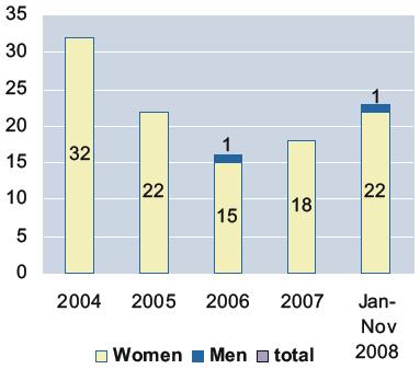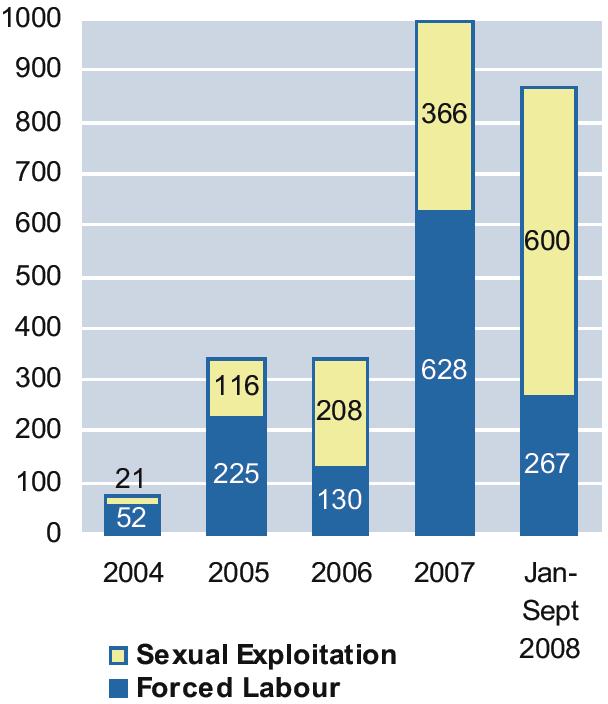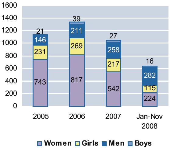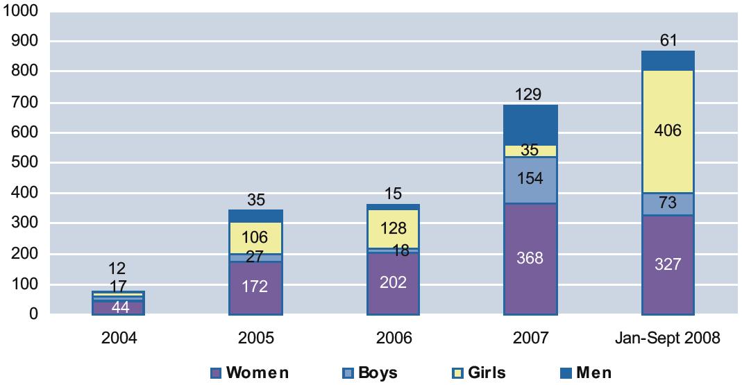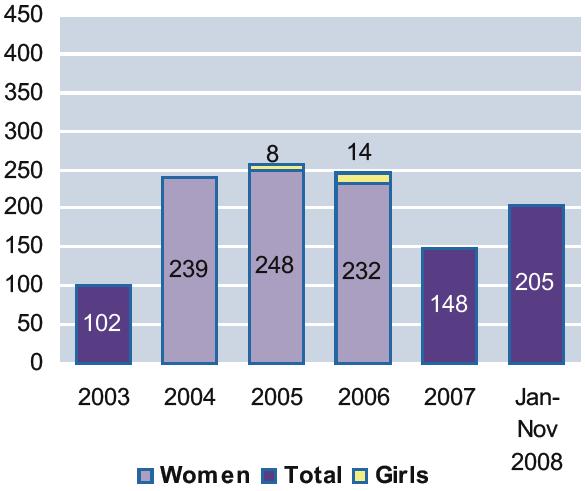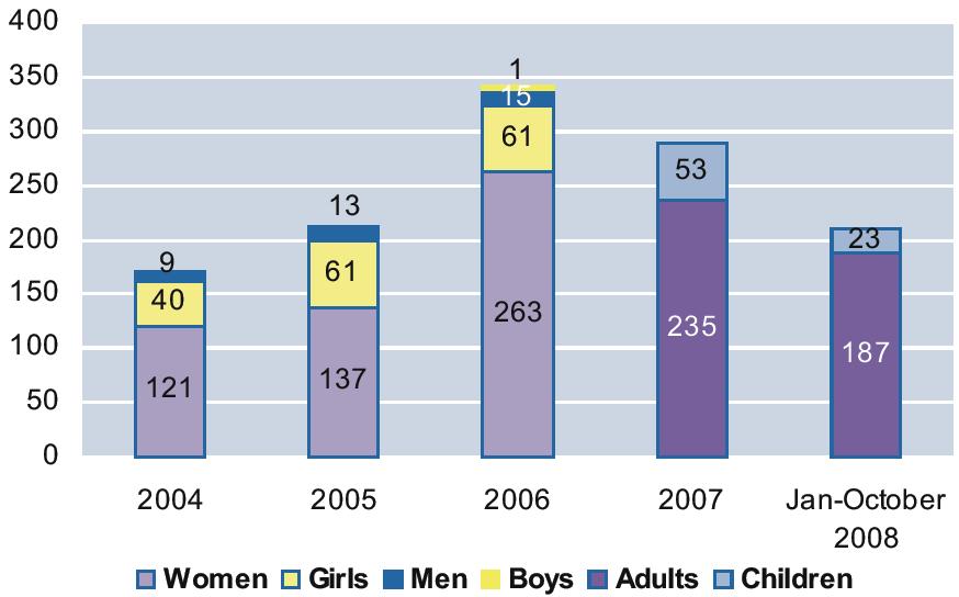In 2004, 62 trafficked persons, 220 in 2005, 191 in 2006, 118 in 2007, 67 in 2008 (as of 3.11.2008) have been assisted by the International Organisation for Migration. 39 trafficked persons took temporary stay permits in Turkey between 2004-2008. The rest of the identified trafficked persons were voluntarily returned by the Ministry of Interior.