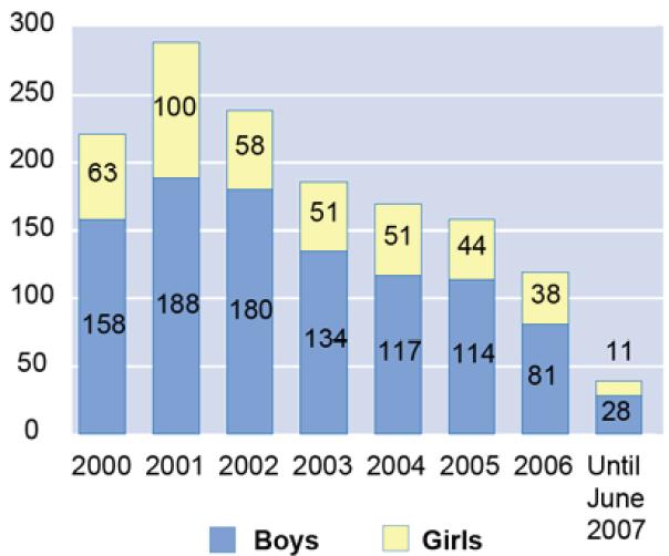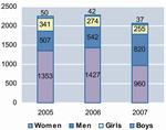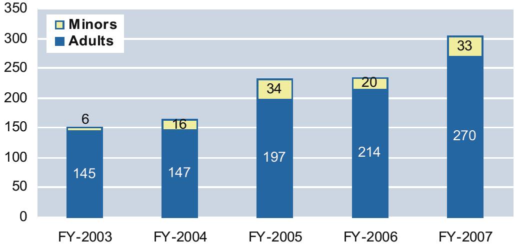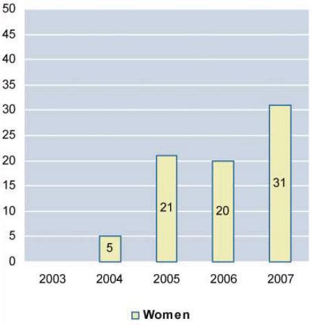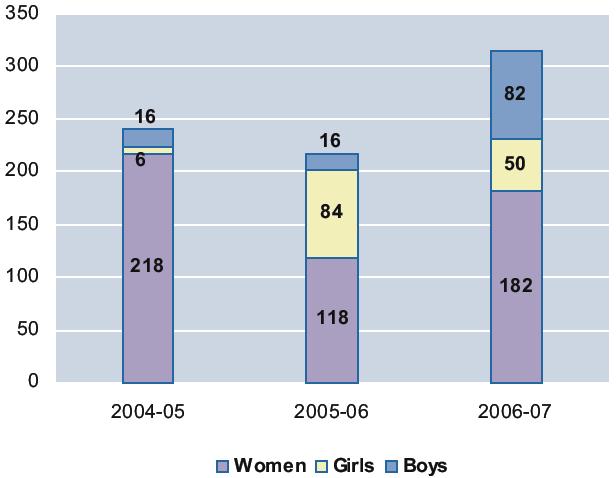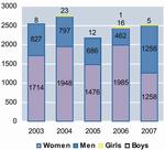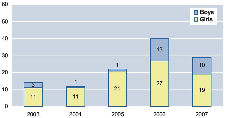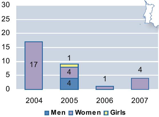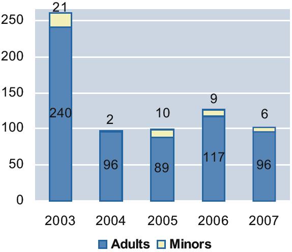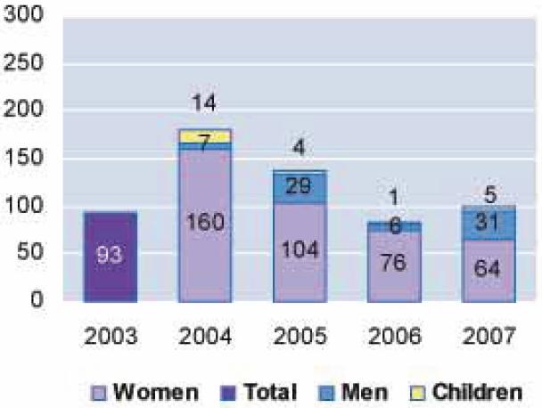 Fig. 388: Victims of trafficking in persons identified by State authorities in the FYR of Macedonia, by gender and age (2003-2007) Fig. 389: Victims of trafficking in persons assisted by IOM in the FYR of Macedonia (2003-2007) Source: Ministry of Interior