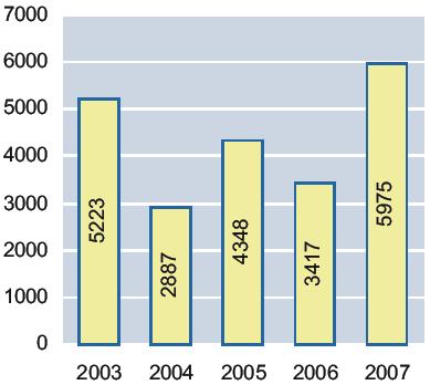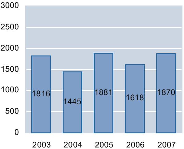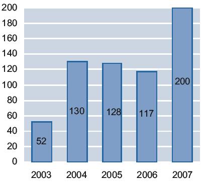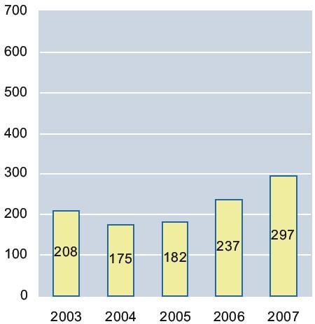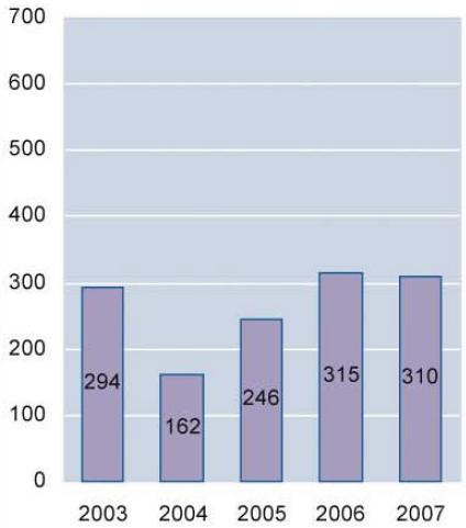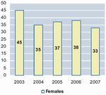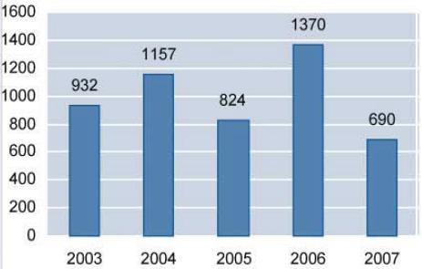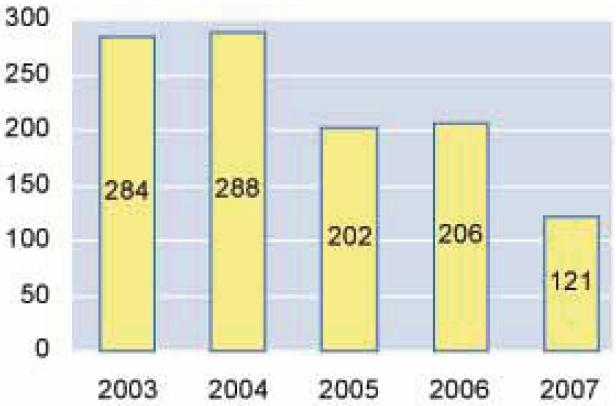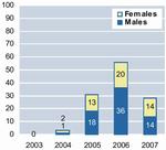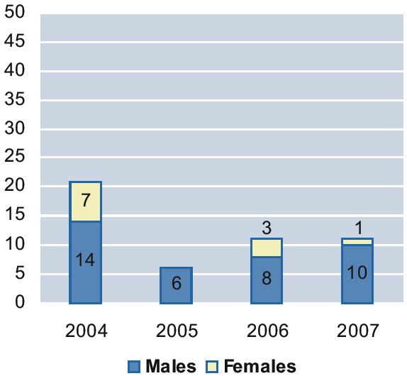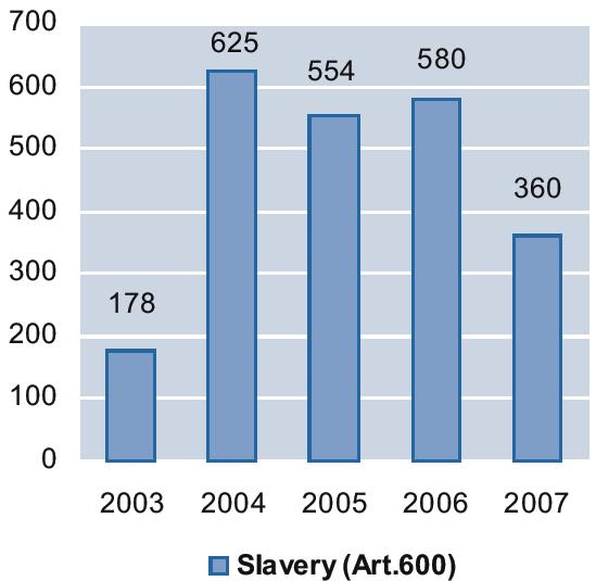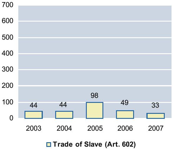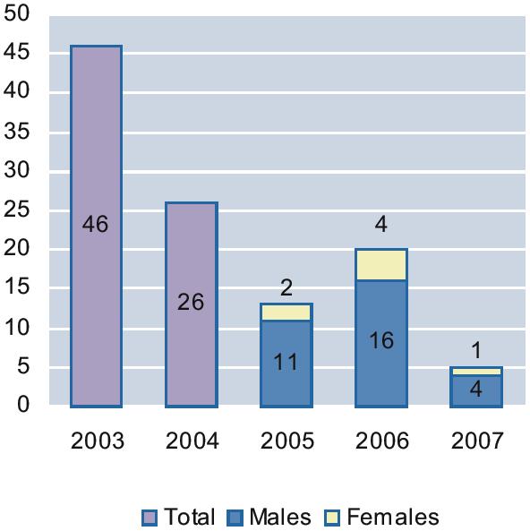 Fig. 365: Persons suspected of trafficking in persons in Slovakia, by gender (2003-2007) Fig. 366: Cases of trafficking in persons investigated in Slovakia (2003-2007) Source: Ministry of the Interior