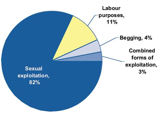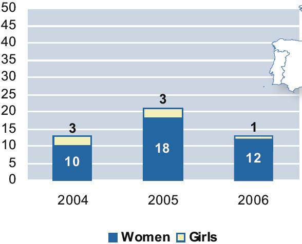 Fig. 377: Victims of trafficking in persons-related offences identified by State authorities in Spain, by gender and age (2003-2007) Fig. 378: Victims of trafficking in persons-related offences identified by State authorities in Spain, by form of exploitation (2005-2006) Source: Centro de Inteligencia contra el Crimen Organizado