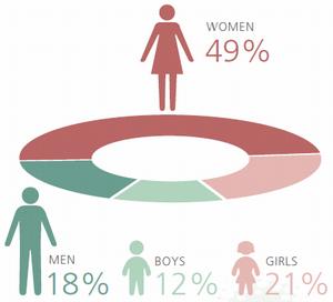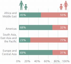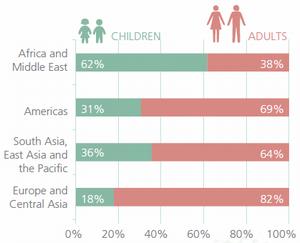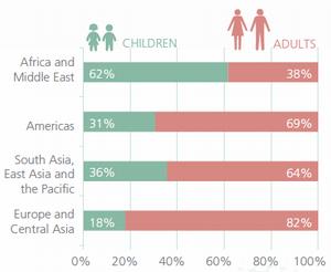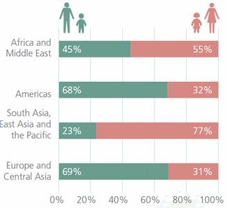 In North Africa and the Middle East, on the other hand, almost all detected victims (95 per cent) are adults. This is the largest share of adult victims of any region or sub-region. While most of the adults are women, at 55 per cent of the total, the share of males is large in a global perspective. Among the 5 per cent of victims who are children, more girls are detected than boys.
