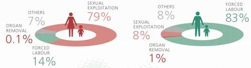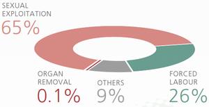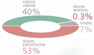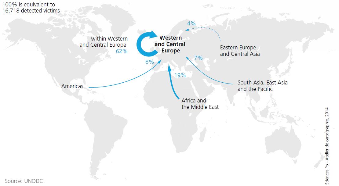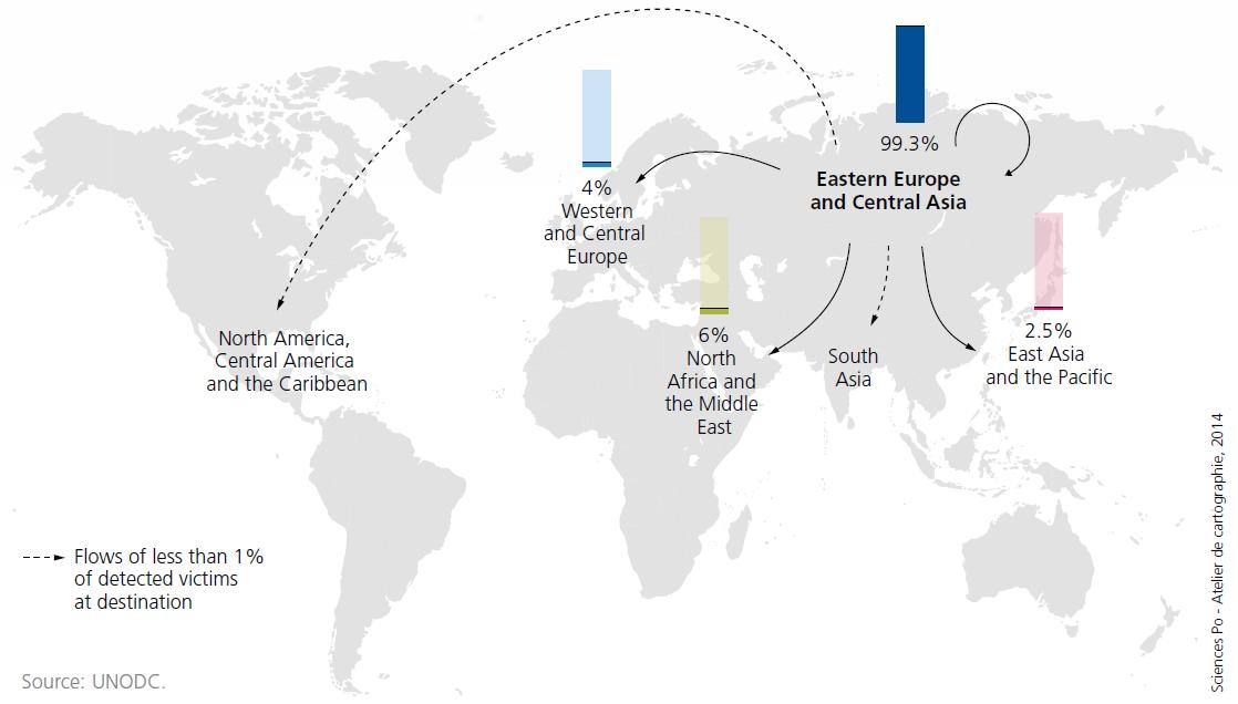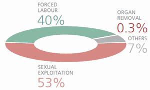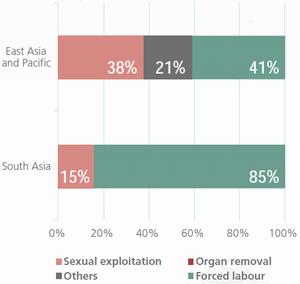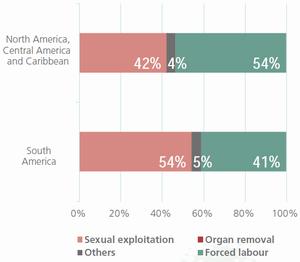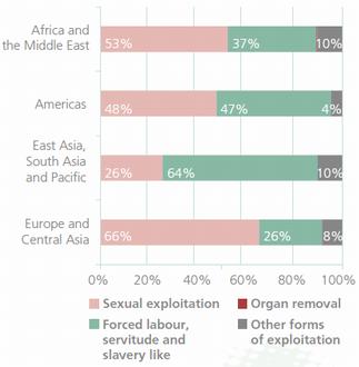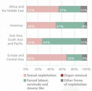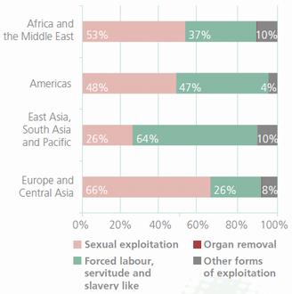 There are considerable regional differences with regard to forms of exploitation. While trafficking for sexual exploitation is the main form detected in Europe and Central Asia, in East Asia and the Pacific, it is forced labour. In the Americas the two types are detected in near equal proportions.