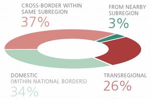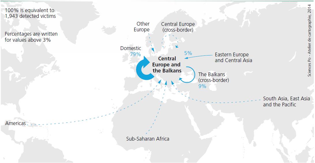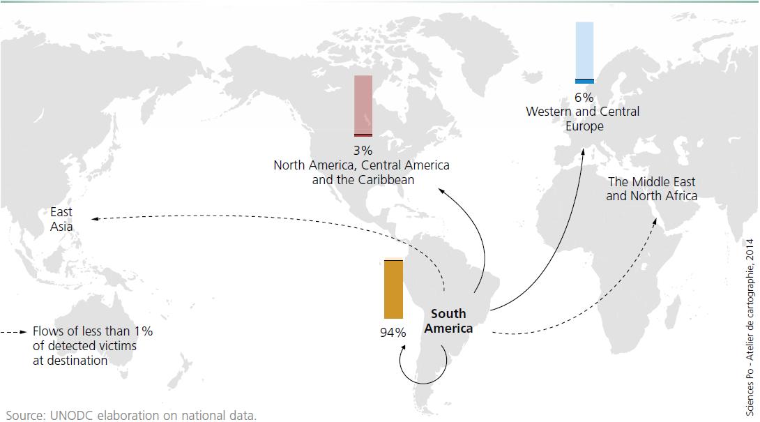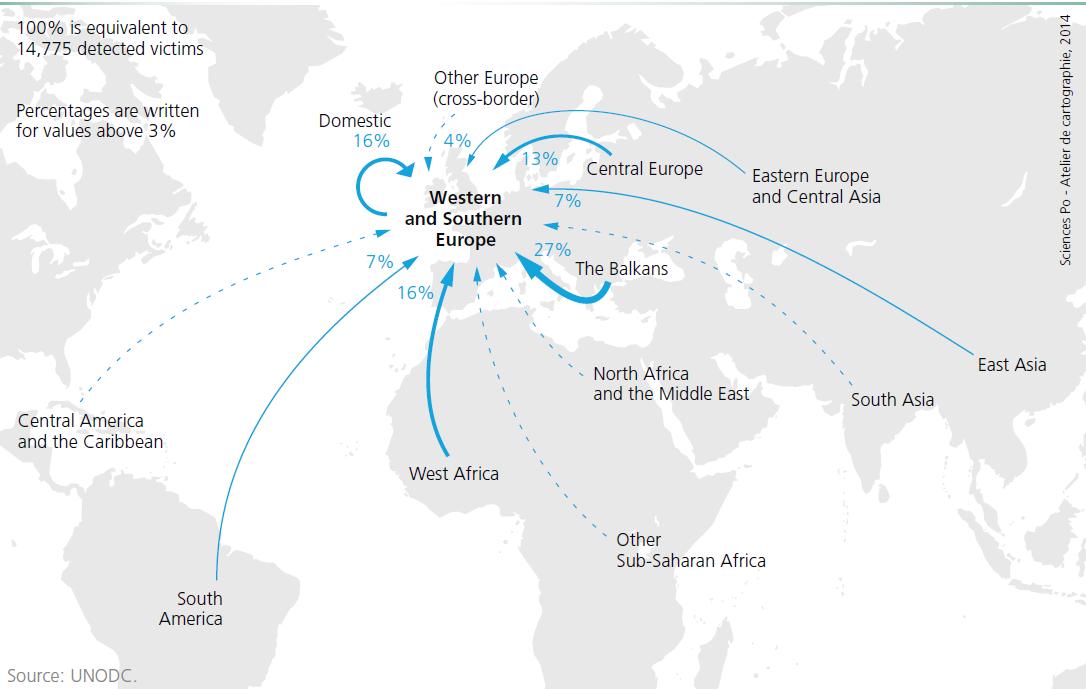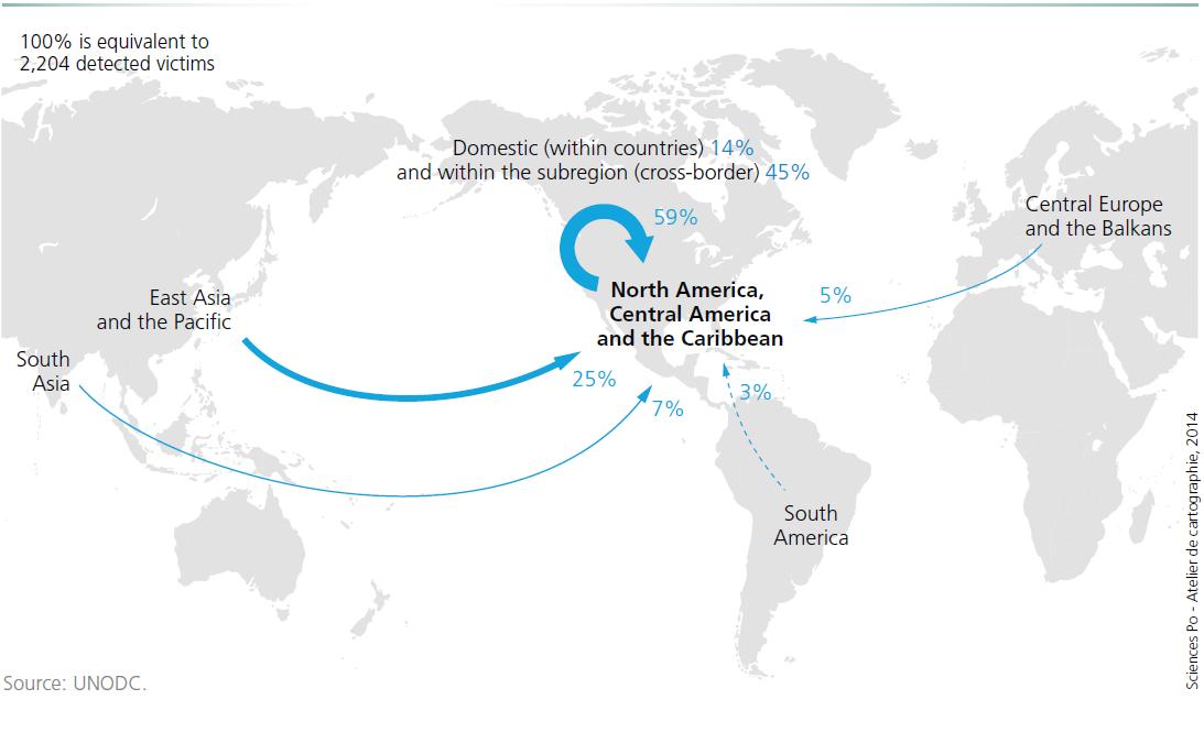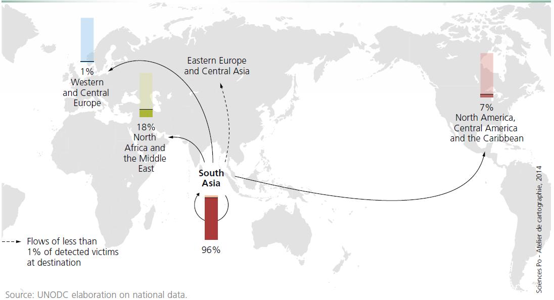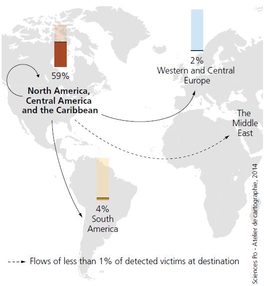 Most trafficking flows are intraregional, meaning that the origin and the destination of the trafficked victim is within the same region; often also within the same subregion. For this reason, it is difficult to identify major global trafficking hubs. Victims tend to be trafficked from poor countries to more affluent ones (relative to the origin country) within the region.
