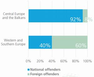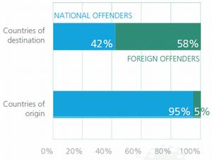 Distribution of national and foreign offenders among countries of origin and destination of cross-border trafficking, 2010-2012 (or more recent)