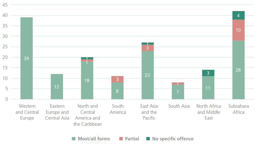 Most of the countries in South Asia, East Asia and the Pacific have legislation that criminalizes all aspects listed in the Trafficking in Persons Protocol. While only a few countries still have partial legislation, the large populations in these countries is an element of concern, as discussed in the global overview.