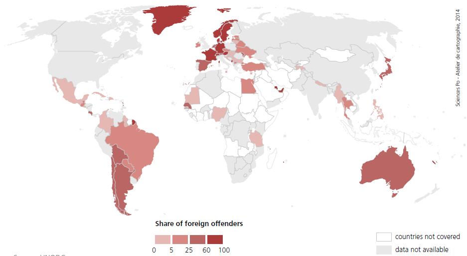MAP 1: Share of foreign offenders among the total number of persons convicted of trafficking in persons, by country, 2010-2012