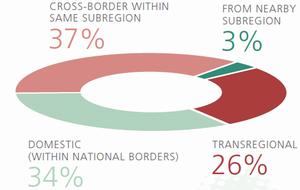 In terms of flows, domestic trafficking is the main type of trafficking in Sub-Saharan Africa. This type of trafficking accounts for more than three quarters of the total number of detected victims in this subregion, which is a very large proportion. Cross-border trafficking flows are normally of short range. Most West African victims are detected in West Africa, most Southern Africans in Southern African countries and so forth. Countries in Sub-Saharan Africa also detect a limited number of victims from other regions, especially East Asia, but these victims comprise a small share of the total number of detected victims.