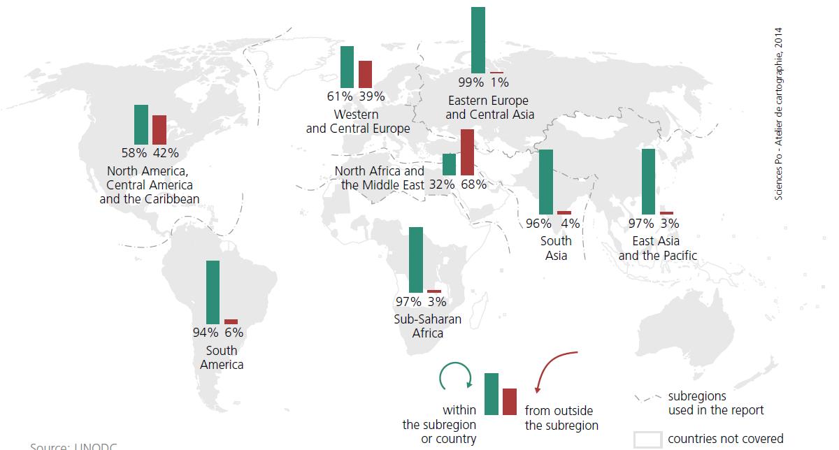 Breakdown of trafficking flows by geographical reach, 2010-2012 (or more recent)