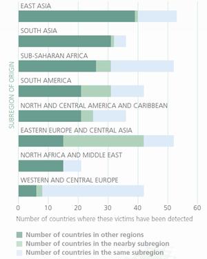Although the region is a significant origin region for victims of transregional trafficking, as for most other parts of the world, the vast majority of the victims detected within South Asia, East Asia and the Pacific are either domestically trafficked or trafficked within the same sub-region. This is true for both the region's subregions, South Asia, as well as East Asia and the Pacific. All countries in the region are origins and destinations simultaneously, with the exceptions of Australia and Japan, which are destination countries for victims from all over the region.