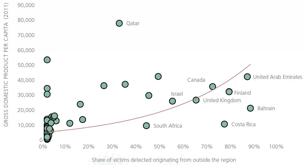 Transregional trafficking flows are mainly detected in the rich countries of the Middle East, Western Europe and North America. These flows often involve victims from the 'global south'; mainly East and South Asia and Sub-Saharan Africa. Statistics show a correlation between the affluence (GDP) of the destination country and the share of victims trafficked there from other regions. Richer countries attract victims from a variety of origins, including from other continents, whereas less affluent countries are mainly affected by domestic or subregional trafficking flows.
